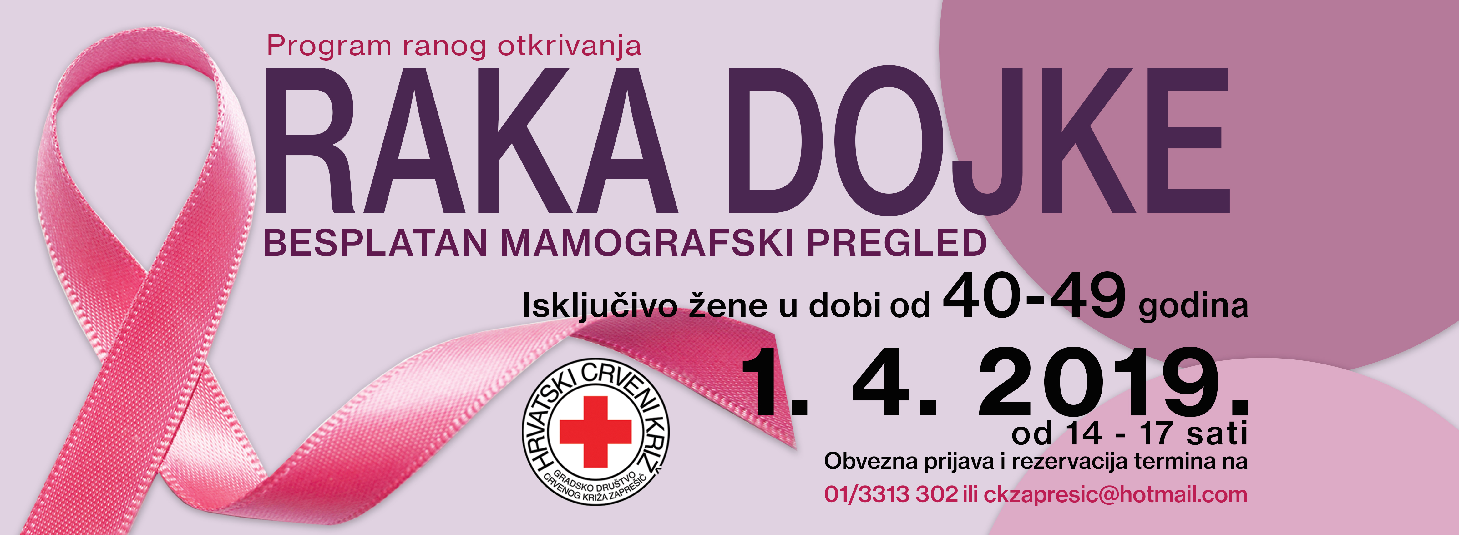 U suradnji s Domom zdravlja Zagrebačke županije, Crveni križ Zaprešić pokrenuo je program ranog otkrivanja raka dojke na svom području (Zaprešić i okolica) te će u ponedjeljak 1.4.2019. godine od 14 do 17 sati biti održan besplatni mamografski pregled.