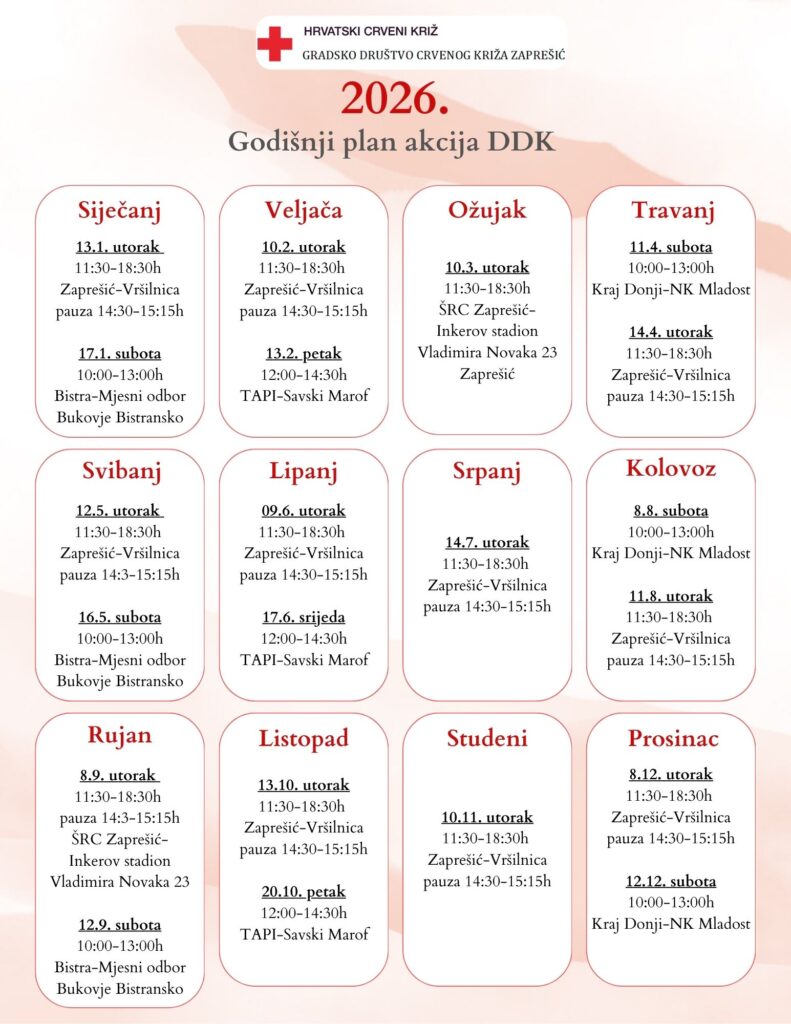 Ukupno u Zaprešiću godišnje imamo 12 redovitih akcija DDK koje se održavaju u našim prostorijama, uz to u Kraju Donjem u općini Marija Gorica imamo godišnje tri akcije DDK te u općini Bistra, a surađujemo i s pogonom Plive u Savskom Marofu gdje povremeno također održavamo akcije DDK.